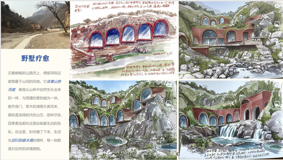大峪沟的村落错落有致地分布在山间,古朴的民居与青山绿水相互映衬,构成了一幅和谐的田园风光图。项目定位为“自然疗愈×山野野趣×文化慢生活”的野趣生活度假综合体,聚焦于为都市人提供一个逃离城市喧嚣、回归自然怀抱的理想之地,让人们在山野间享受宁静与自由,感受文化的熏陶与滋养,实现身心的深度疗愈。